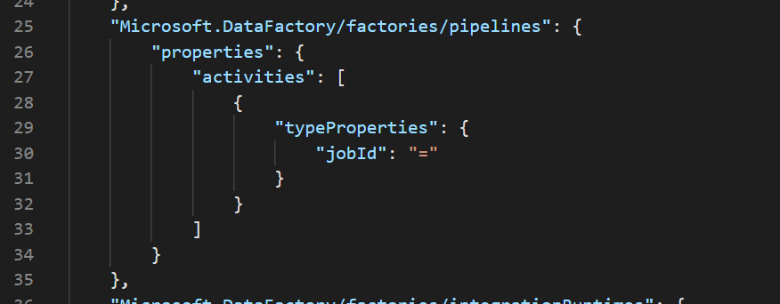 And this is the property we are interested in parameterizing: $.properties.activities.typeProperties.jobId